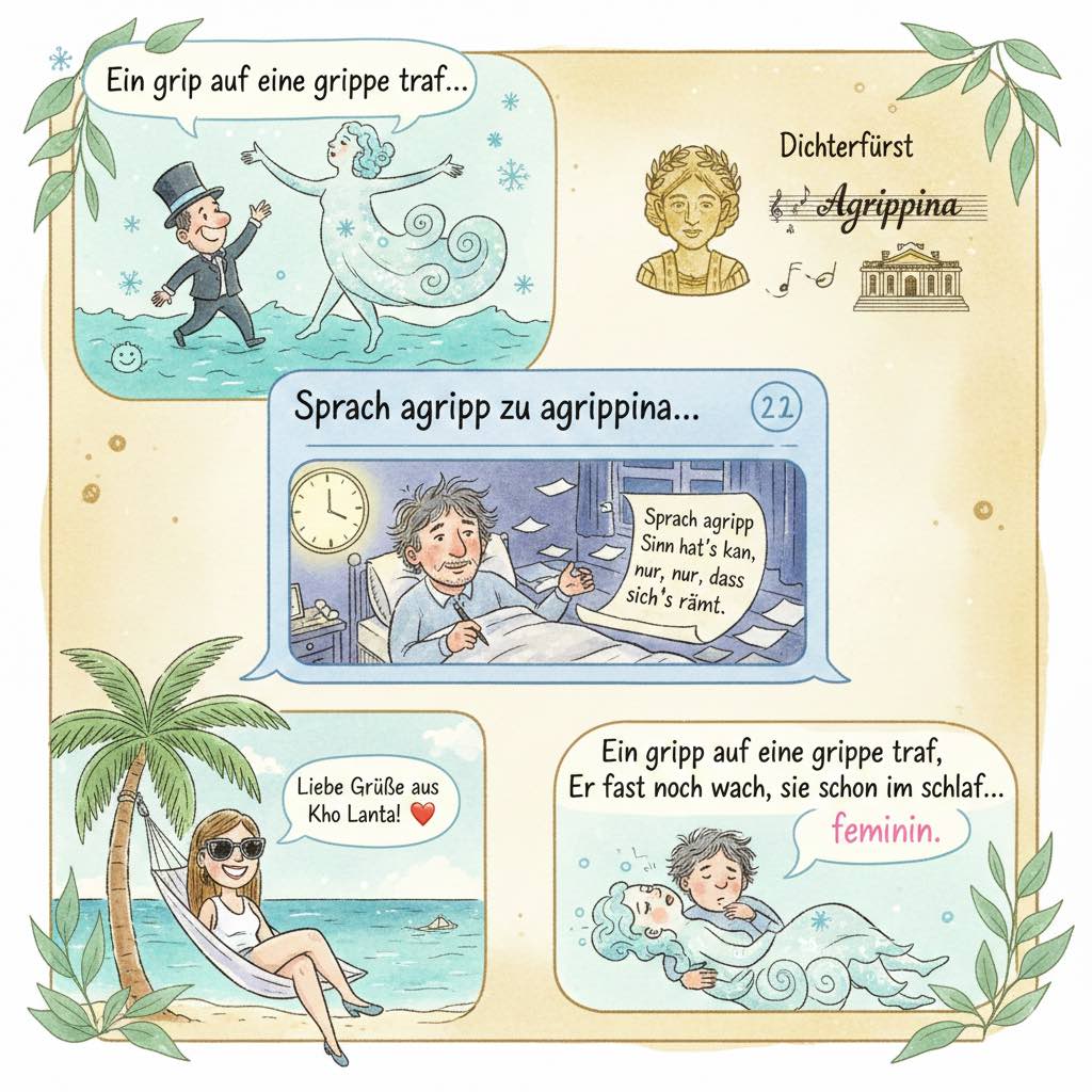 Psychologisch ist das ein starkes Statement für die Psychohygiene. In einer Welt, die oft Sinnhaftigkeit und Produktivität fordert, erlaubt sich die Gruppe hier den „Lustgewinn“ durch reines Sprachspiel. Das letzte Gedicht zeigt zudem eine interessante Auseinandersetzung mit Identität und Grammatik (die Vermännlichung/Verweiblichung der Grippe), was eine spielerische Form der Krankheitsverarbeitung darstellt.